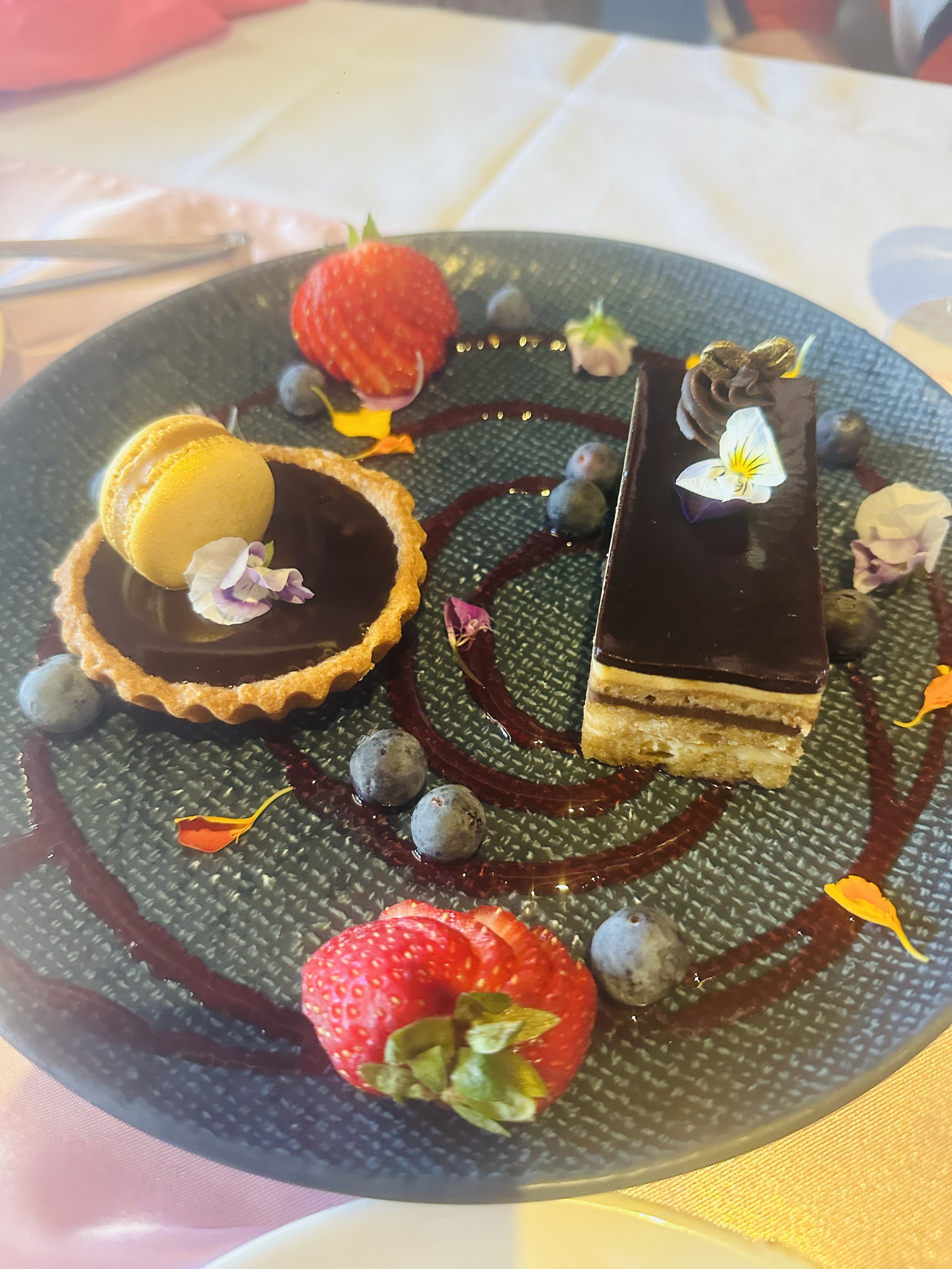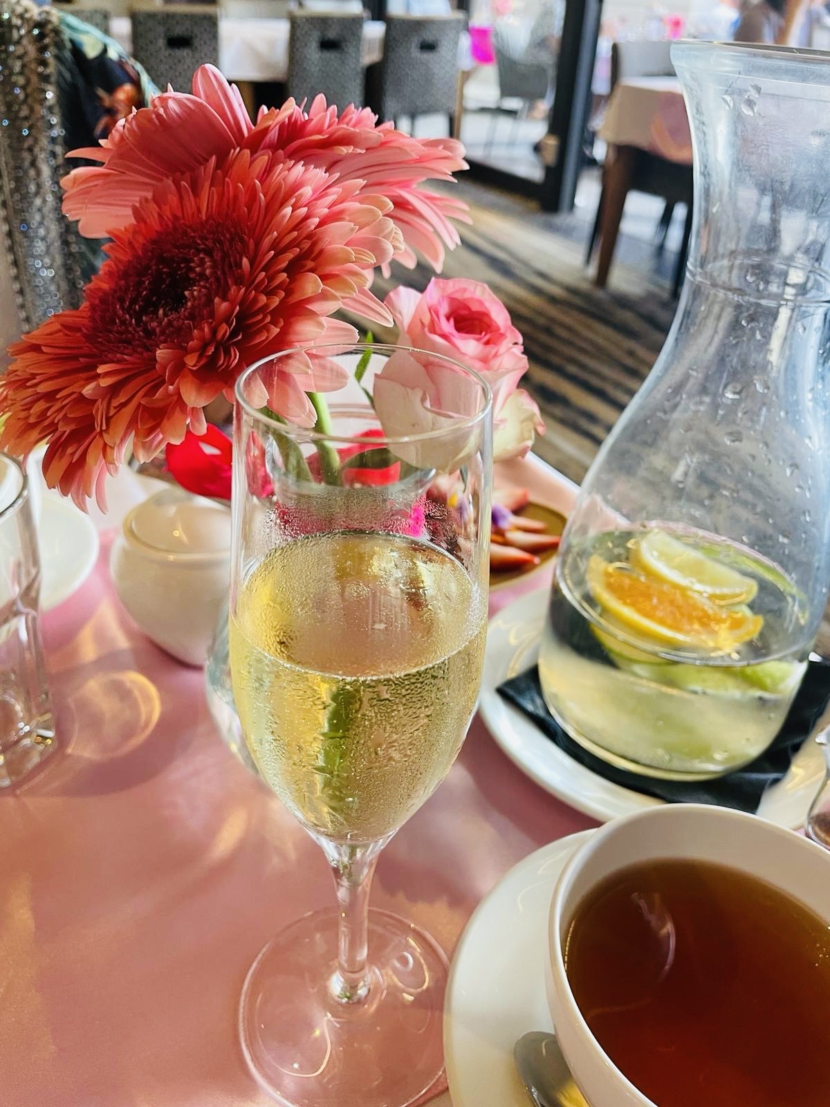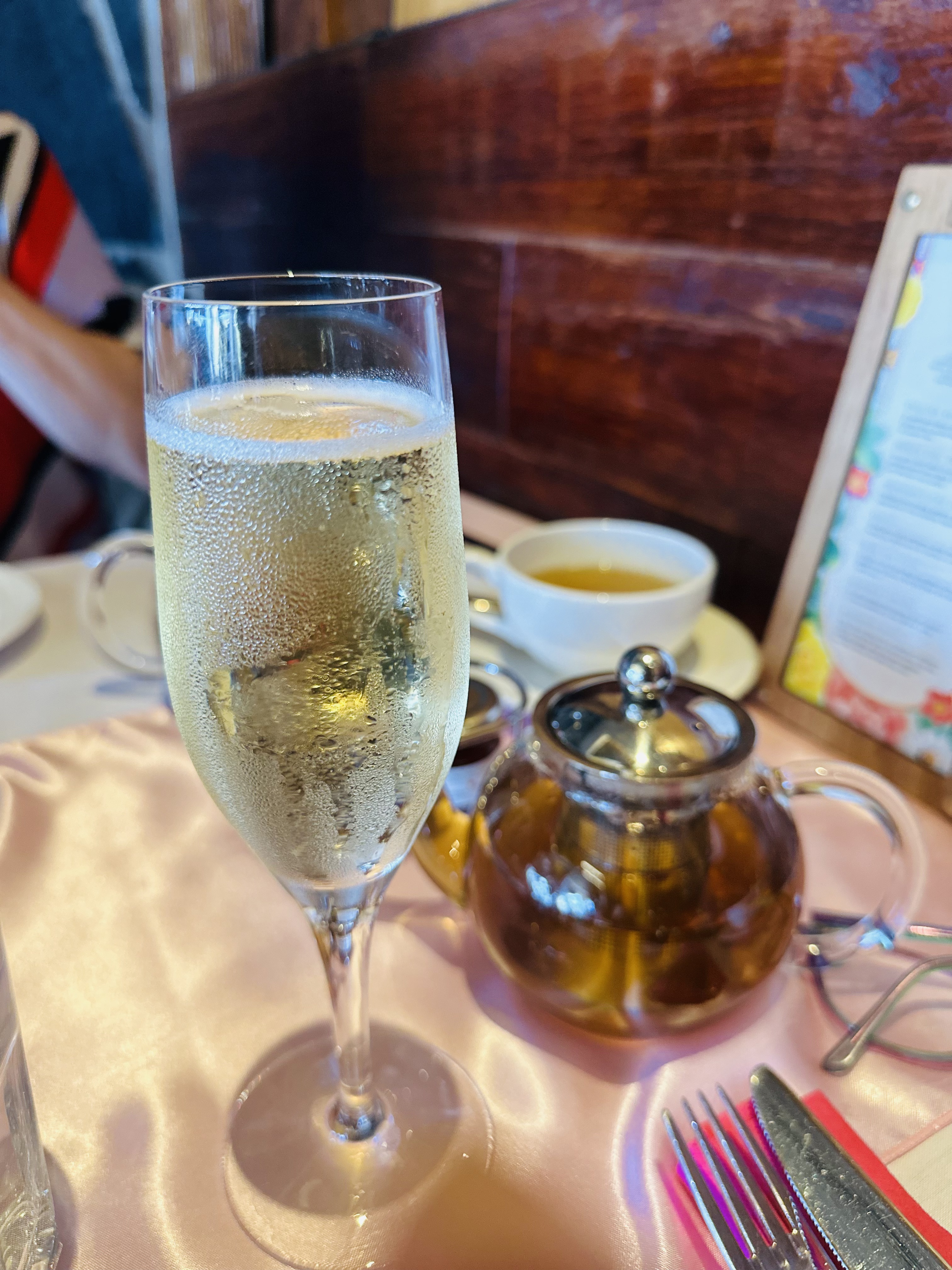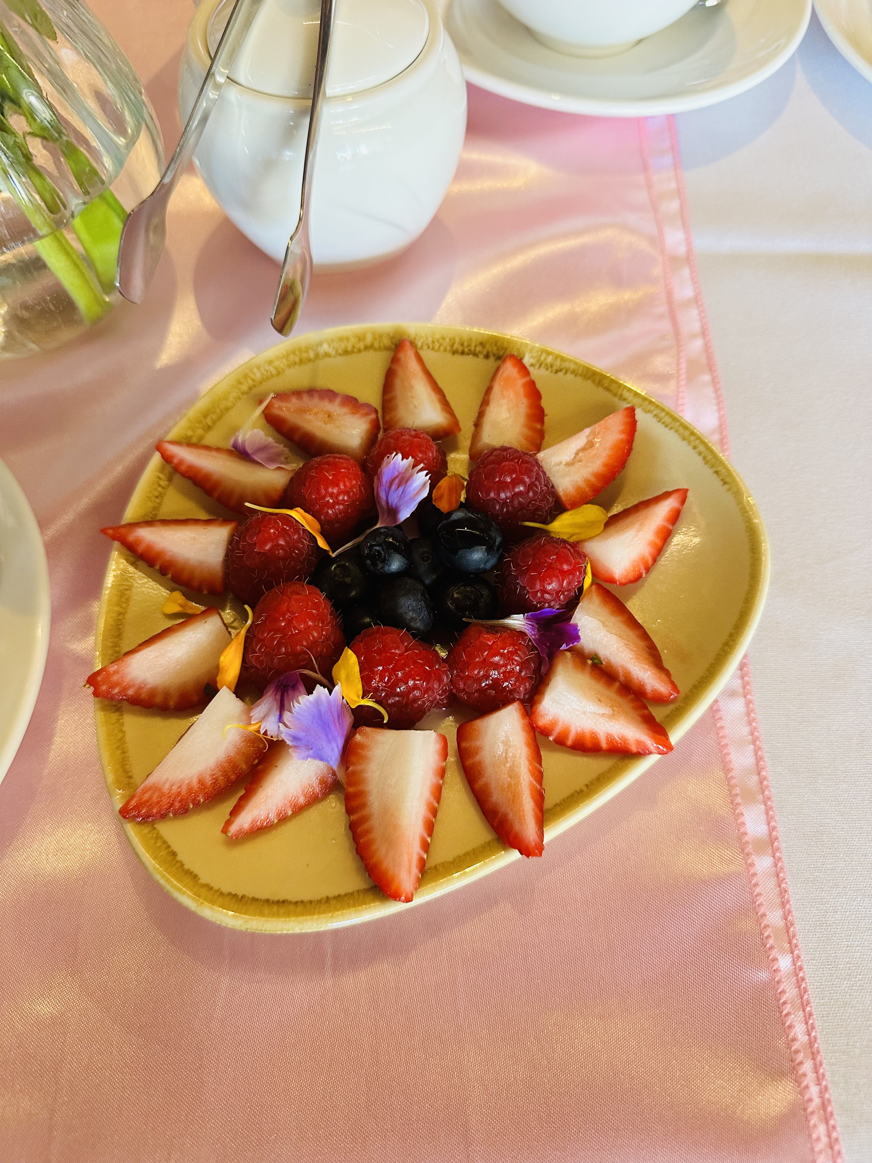 After being seated, we were invited to choose from a thoughtfully curated tea selection. Our chilled sparkling wine was served swiftly, followed by a beautifully arranged tiered stand showcasing a variety of delicacies. Of particular note was the diabetic-friendly cream prepared especially for me, alongside an appealing mix of cakes, pastries, and a personal platter of fresh seasonal fruits.