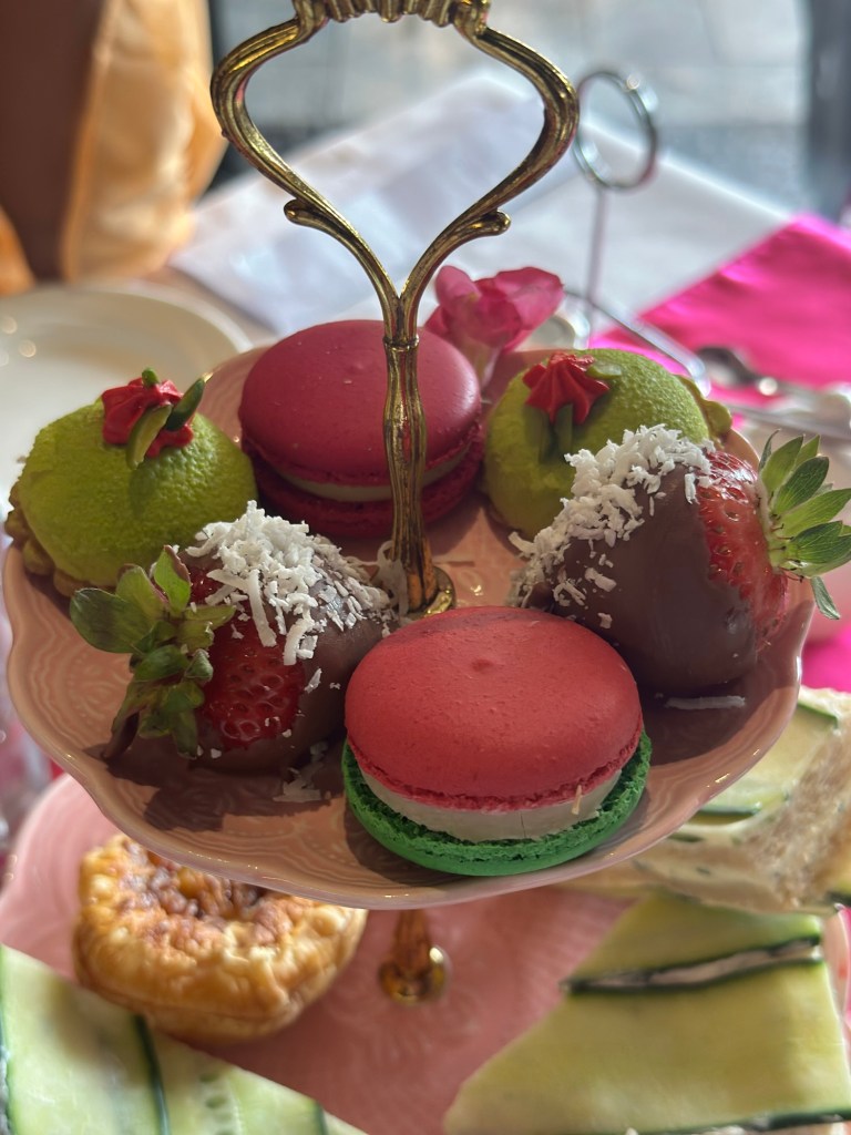 The presentation was exceptional, with each item artfully plated. The sandwiches were notably fresh and generously filled—especially the chicken variety. The menu featured a pleasing blend of traditional high tea staples and modern interpretations. The macarons were both delicate and flavorful, while the chocolate-dipped strawberries, finished with red and white decorative stripes, were a standout.