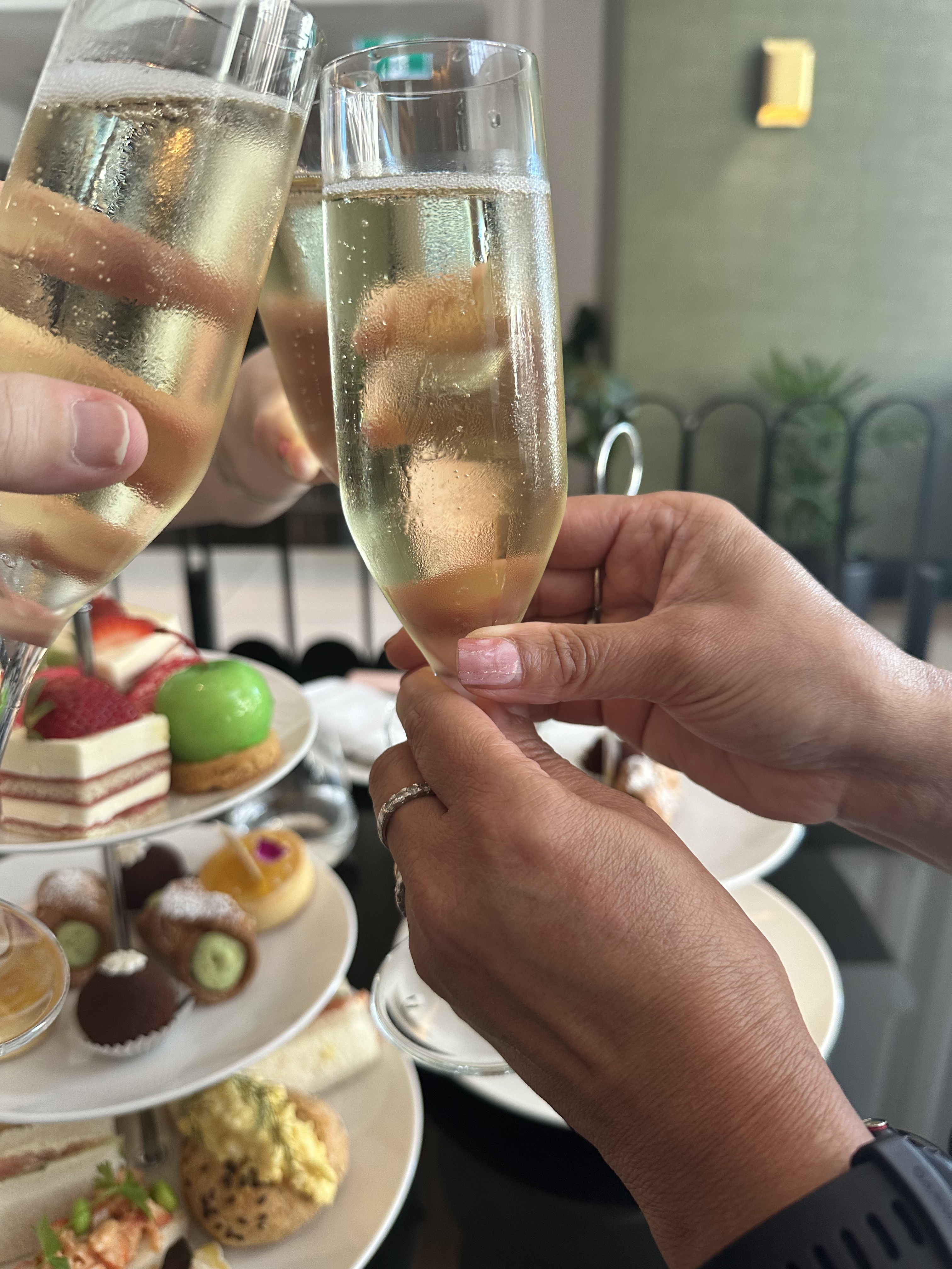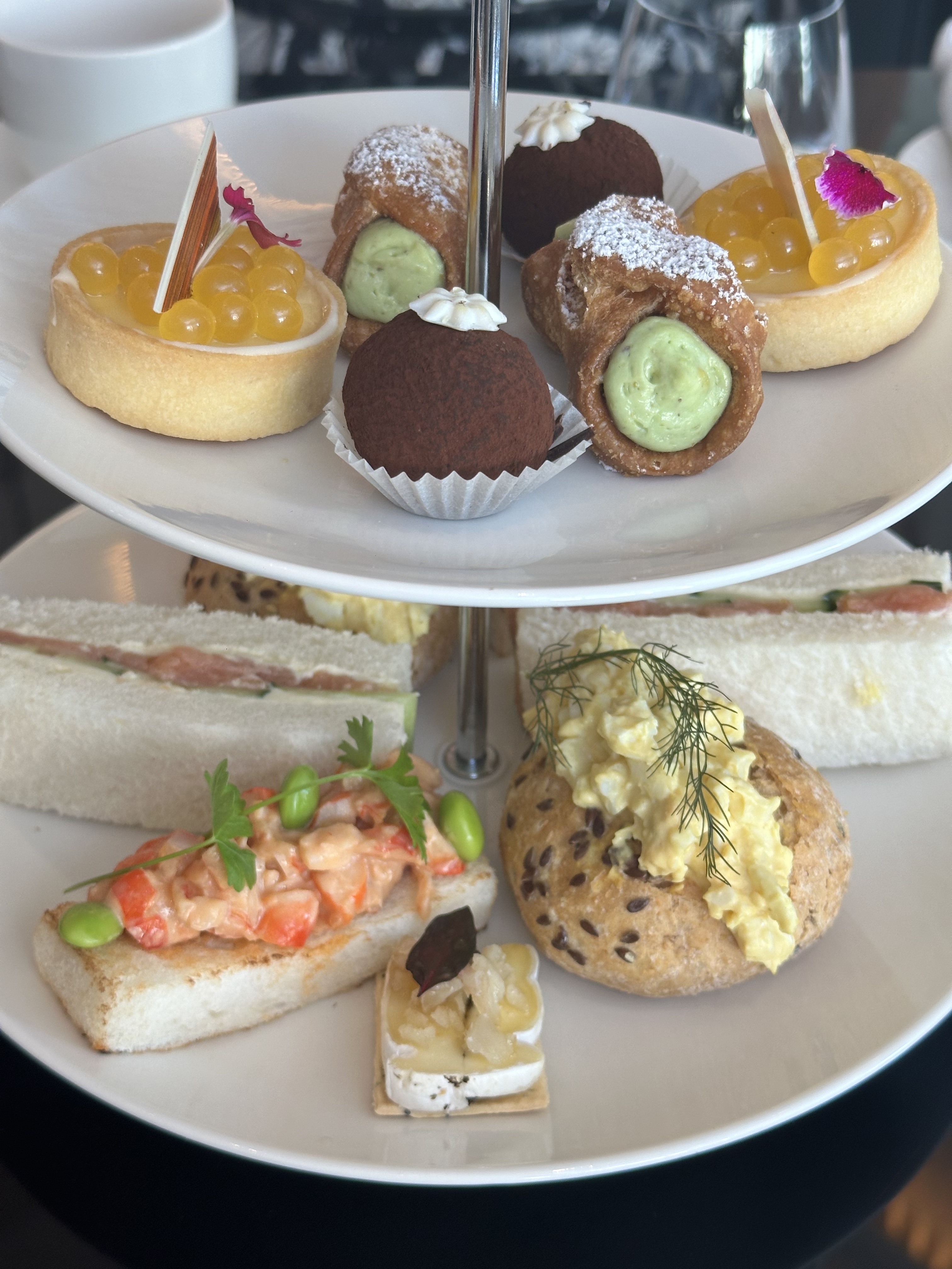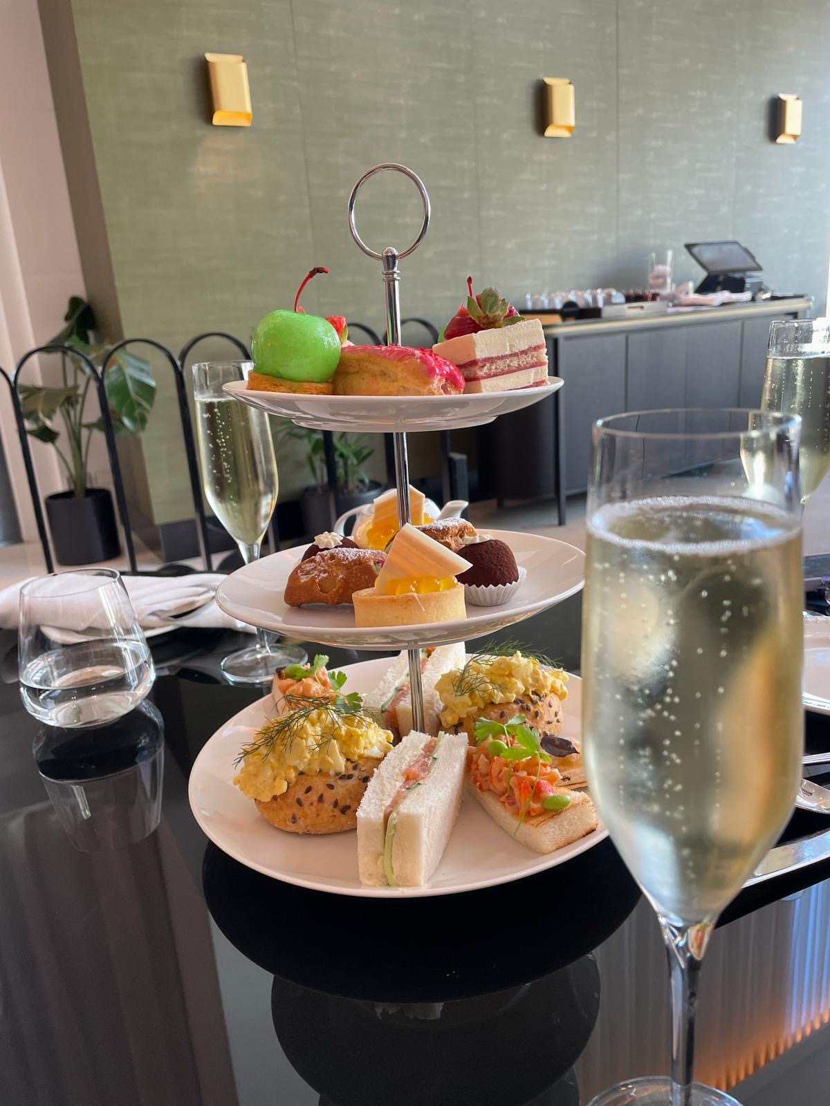 The food: Once seated, we opted for the sparkling high tea. Considering it was a last-minute preparation, the food was satisfactory. The scones were tasty, and the mini sweets were delicious. However, the sandwiches were not as fresh, and the savoury treats were quite ordinary. It seemed likely that the mini cakes, sandwiches, and scones were pre-prepared and possibly kept frozen, although this is just an assumption.
