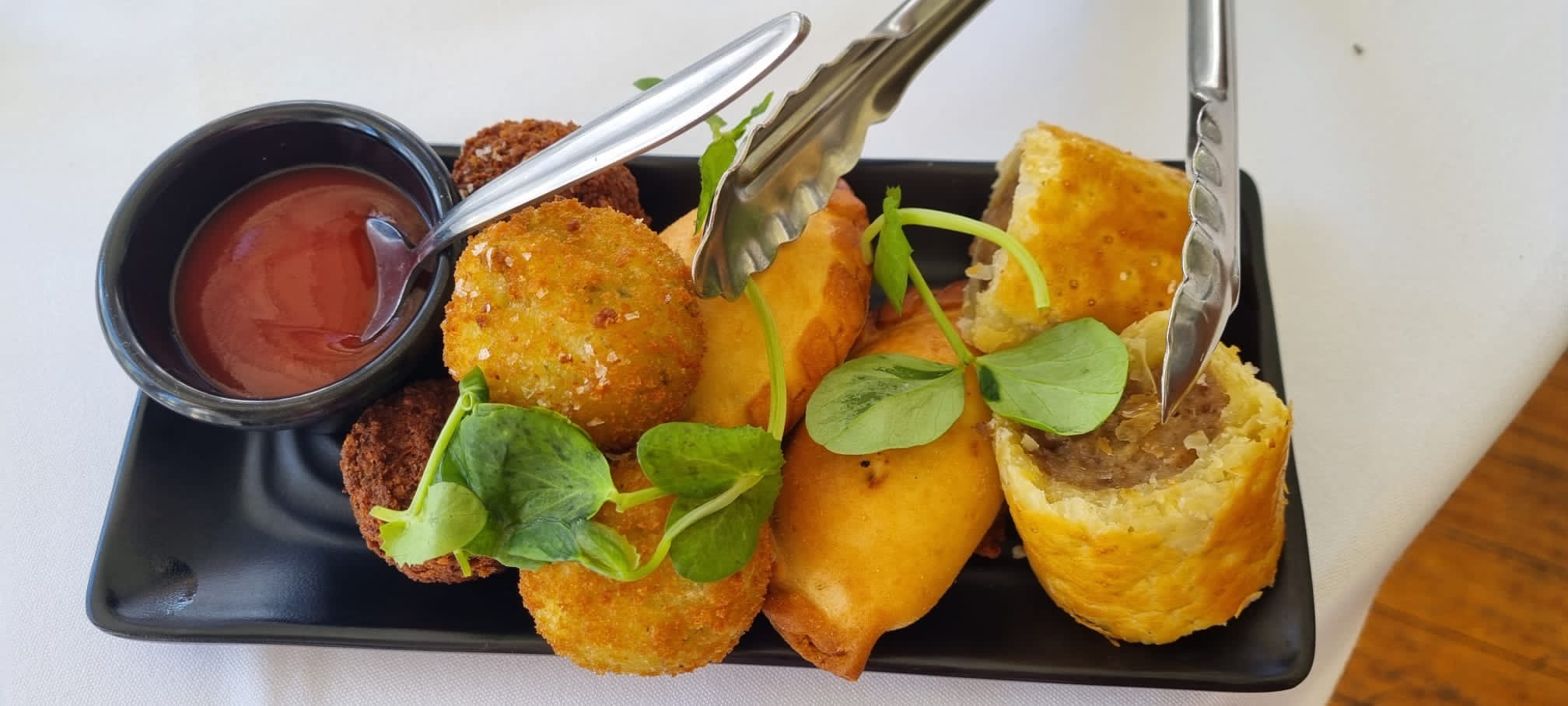 The menu impressed with its array of teas and a tantalizing selection of hot savoury dishes like Arancini, sausage rolls, and various pates, sliders, and sandwiches—perfect for us lovers of hot food. The sweets were equally delightful, featuring delicious petits fours, macarons, and the essential scones.