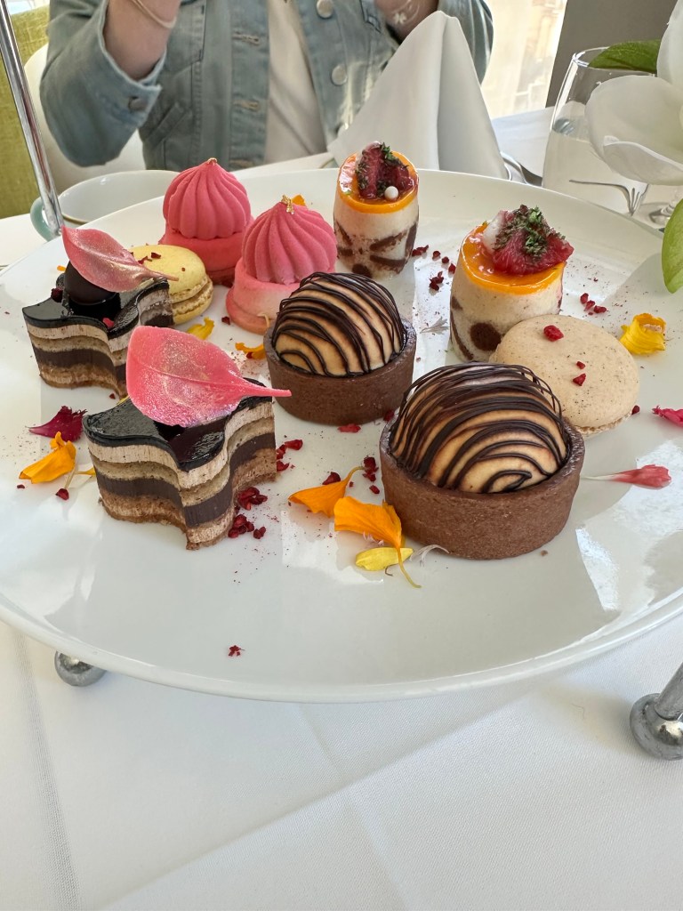 The High Tea itself exceeded all expectations. While the bottomless sandwiches were a highlight, they were far from ordinary. In addition to a variety of delicious sandwiches, we were treated to savoury croissants, mini burgers, and a beautifully presented chicken coronation sandwich in the form of a pinwheel. The savoury offerings were diverse and satisfying, creating a perfect balance to the sweetness of the treats to follow.