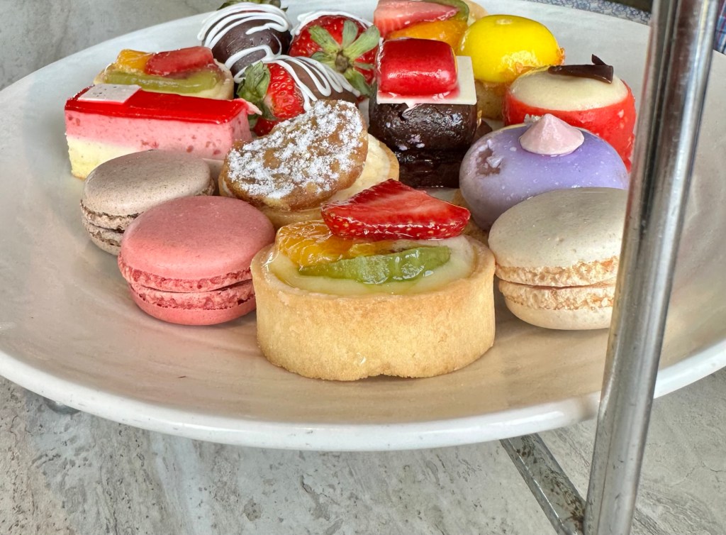 The experience begins with a leisurely boarding at King Street Wharf in Darling Harbour, followed by a warm welcome on deck. Once seated, guests are served a classic high tea spread delicate finger sandwiches filled with cold meats, prawns, ham, and smoked salmon, alongside savoury pastries and mini quiches. Traditional scones, perfectly paired with jam and cream, and a colourful selection of petits fours round out the offering. A glass of sparkling wine is included, setting a celebratory tone from the very start, with additional drinks and cocktails available for purchase at the onboard bar.