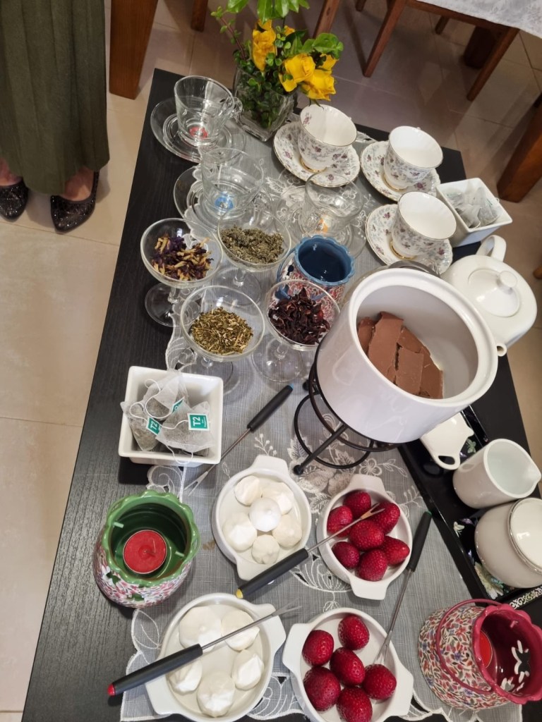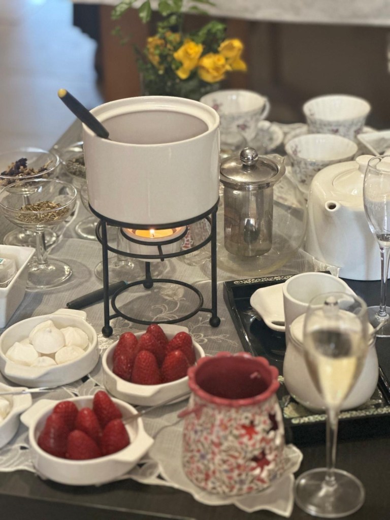 As guests arrived, they were welcomed with sparkling wine and a decadent chocolate fondue accompanied by fresh strawberries and marshmallows—an indulgent start that set the tone for the afternoon.