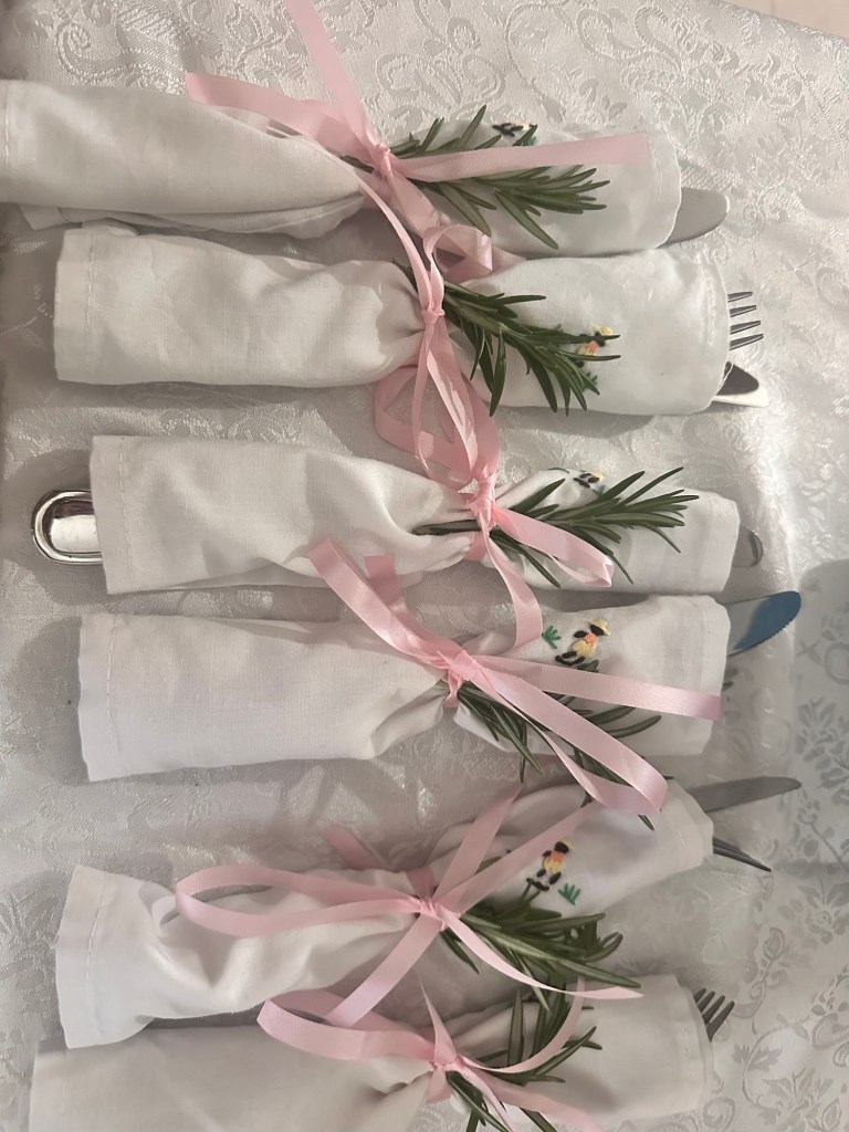 To set the scene, we dressed the table with a crisp white tablecloth adorned with a pink, sparkly table runner. Each place setting featured crockery delicately wrapped in an embroidered napkin, tied with a pink ribbon and a sprig of fresh rosemary. Rustic floral arrangements added a soft, natural touch to the ambiance.